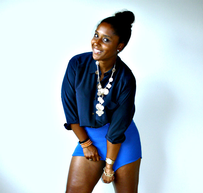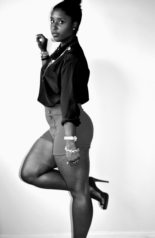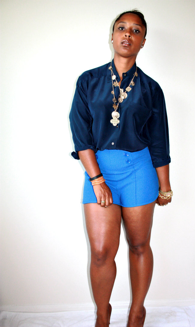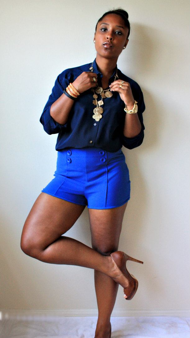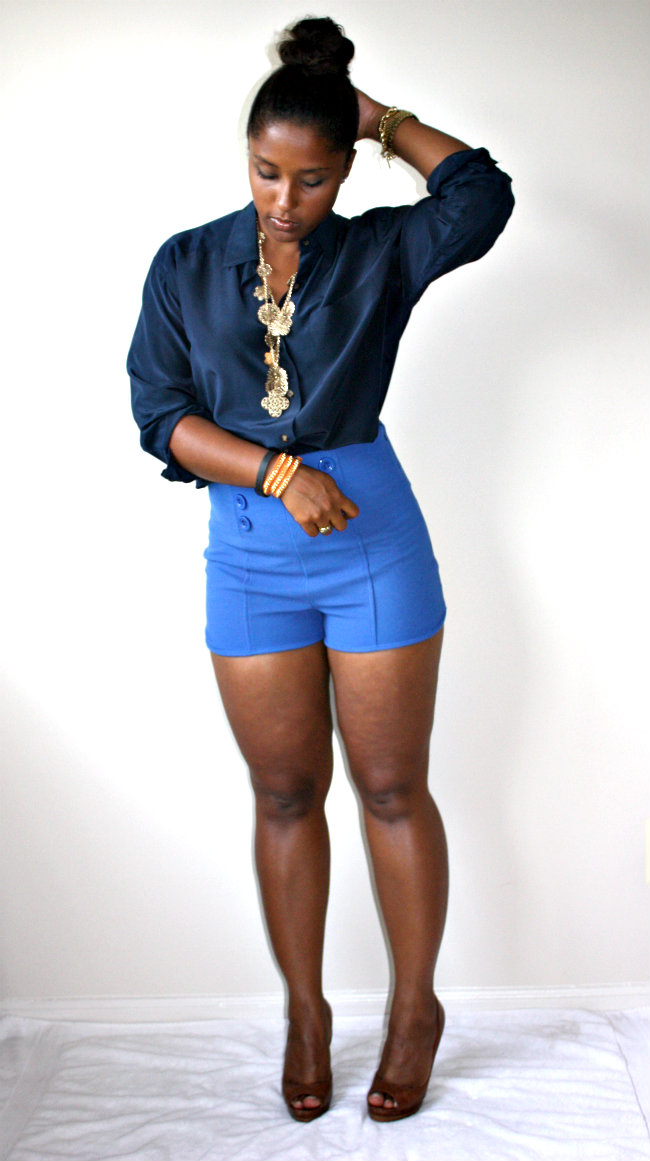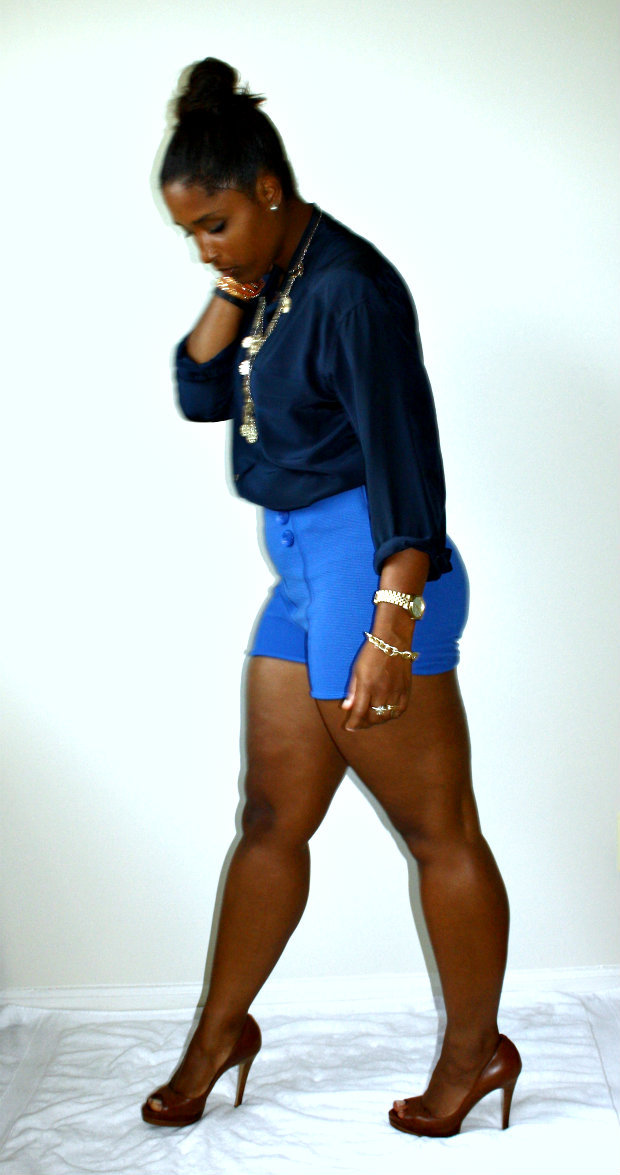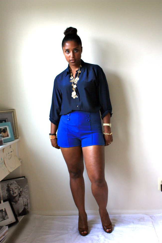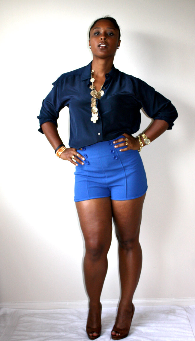 Its finally not the Devil’s Playground outside and Im enjoying the slight coolness in the air. I finally got to whip out my silk Liz Claiborne shirt I found while thrifting in Virginia and paired it with my high waisted sailor inspired short shorts! I know that my mom will probably have a bad comment about the length and cut of these shorts and I do love you manman and followed your advice with something loose on top so BE NICE, hahaahh! I recently was on Wardrobe Oxygen’s site and saw she is having a giveaway for a Not Photoshopped T-Shirt and I am DYING to win it. I see SOOOOO much photoshopping in blogs these days and it makes me SO incredibly sad. I live and die by the motto of “To Each His/Her Own” but I believe the purpose of a personal style blog is to showcase our uniqueness and individuality and to get away from all the alterations and enhancements in main stream fashion media. I want young impressionable women to see women who look like them making it in fashion so that they too feel they can do it! I am all about editing for colors and sharpness but to change your face or airbrush your bad skin just seems a tad dishonest to me. Be you and Be proud of that. With all that said, these are my thighs and all their cellulite glory lol. I refuse to airbrush and/or smooth them out so please enjoy the dimples and bumps that come with being a real woman with real curves. Yes I do need to work out more but hey at this point in the game this is what I look like and I dont mind it all that much!!!! Be confident in how you are made because we are all unique and I pray none of us want to be cookie cutter images of what’s currently categorized as “beautiful”!